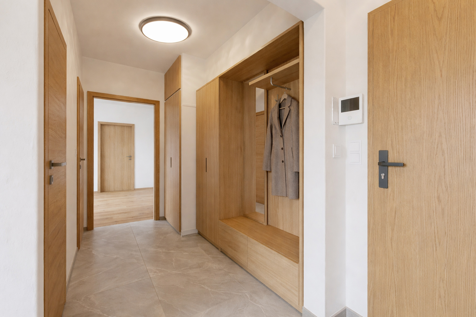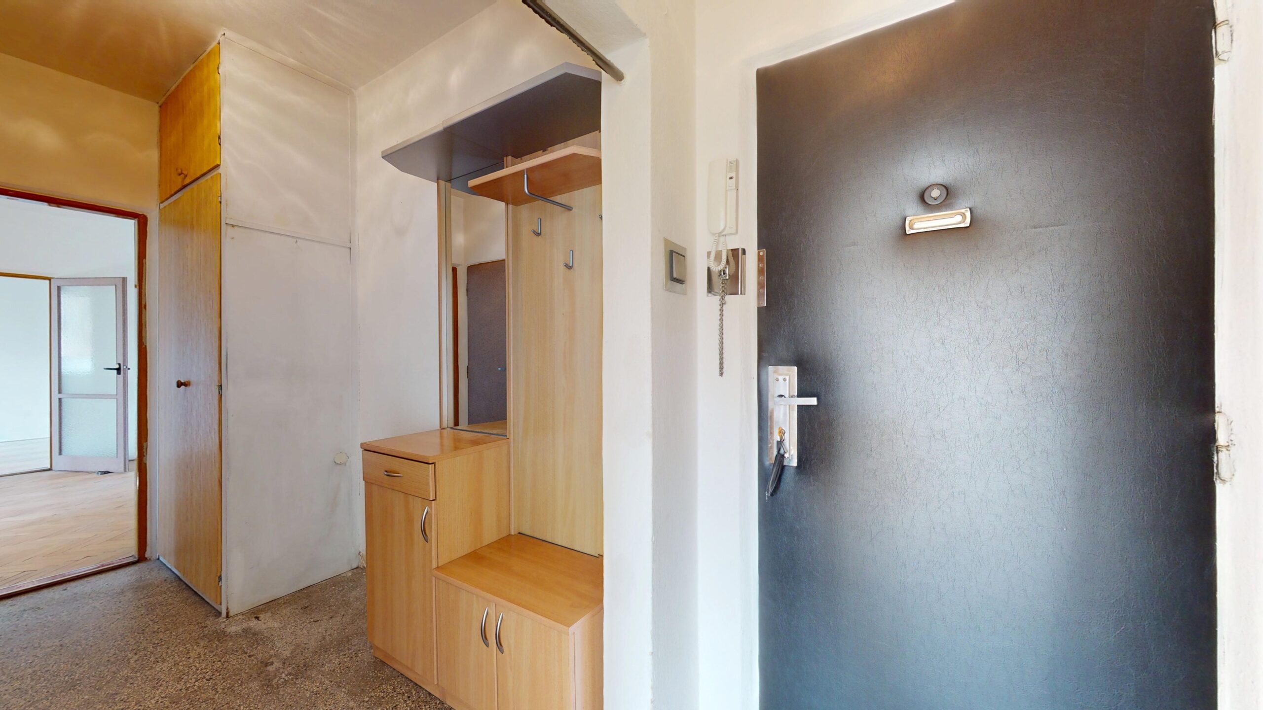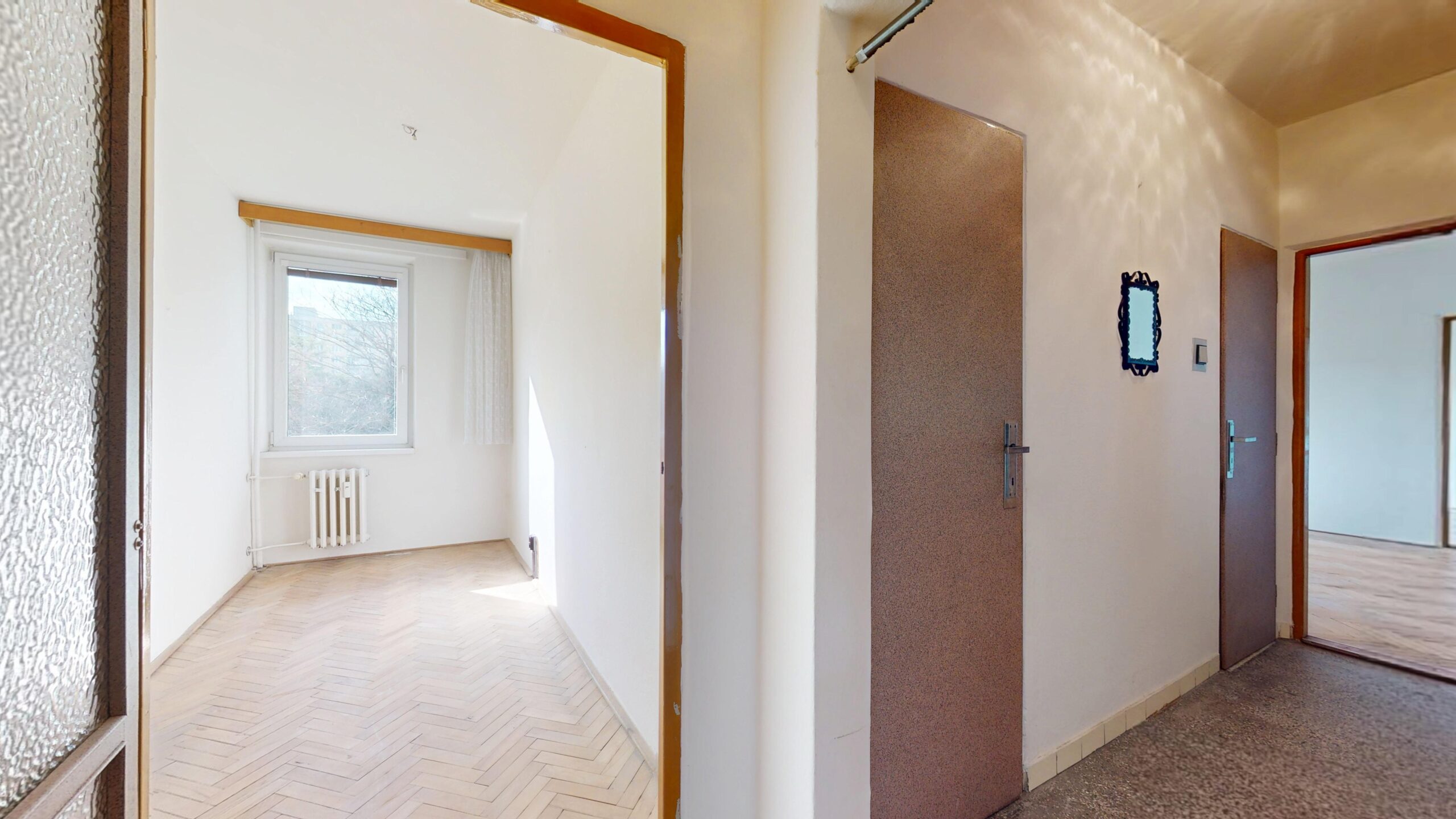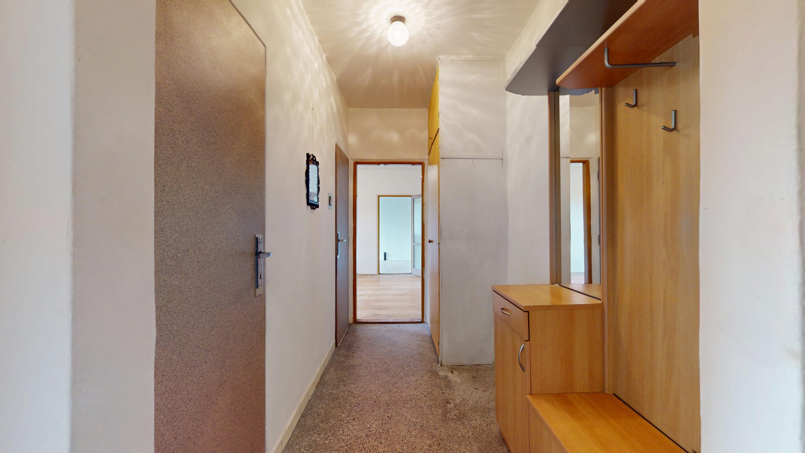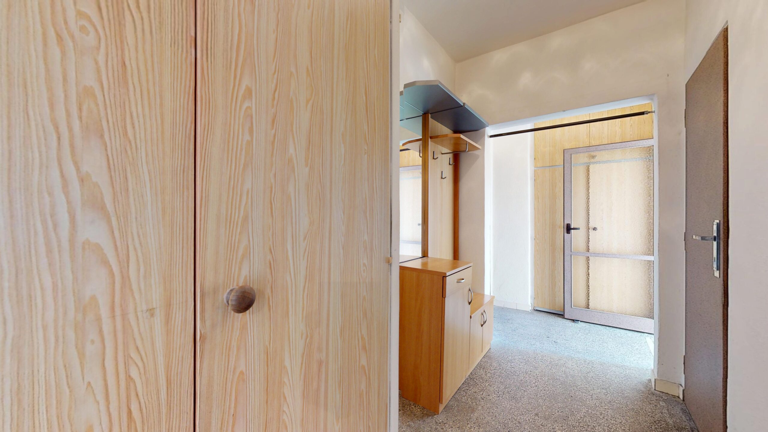 Po vstupe sa ocitnete v chodbe, ktorá príjemne prekvapí svojou rozlohou. Priestor je účelne zariadený dvoma vstavanými skriňami a starším nábytkom tak, aby ste tu pohodlne odložili topánky, kabáty aj drobnosti každodenného života. Vstupná chodba zároveň prepája celý byt – priamo oproti dverám sa nachádza vstup do menšej izby, a keď pokračujete ďalej dostanete sa do samostatného WC, do kúpeľne a chodba sa plynulo otvára smerom do dennej časti bytu.