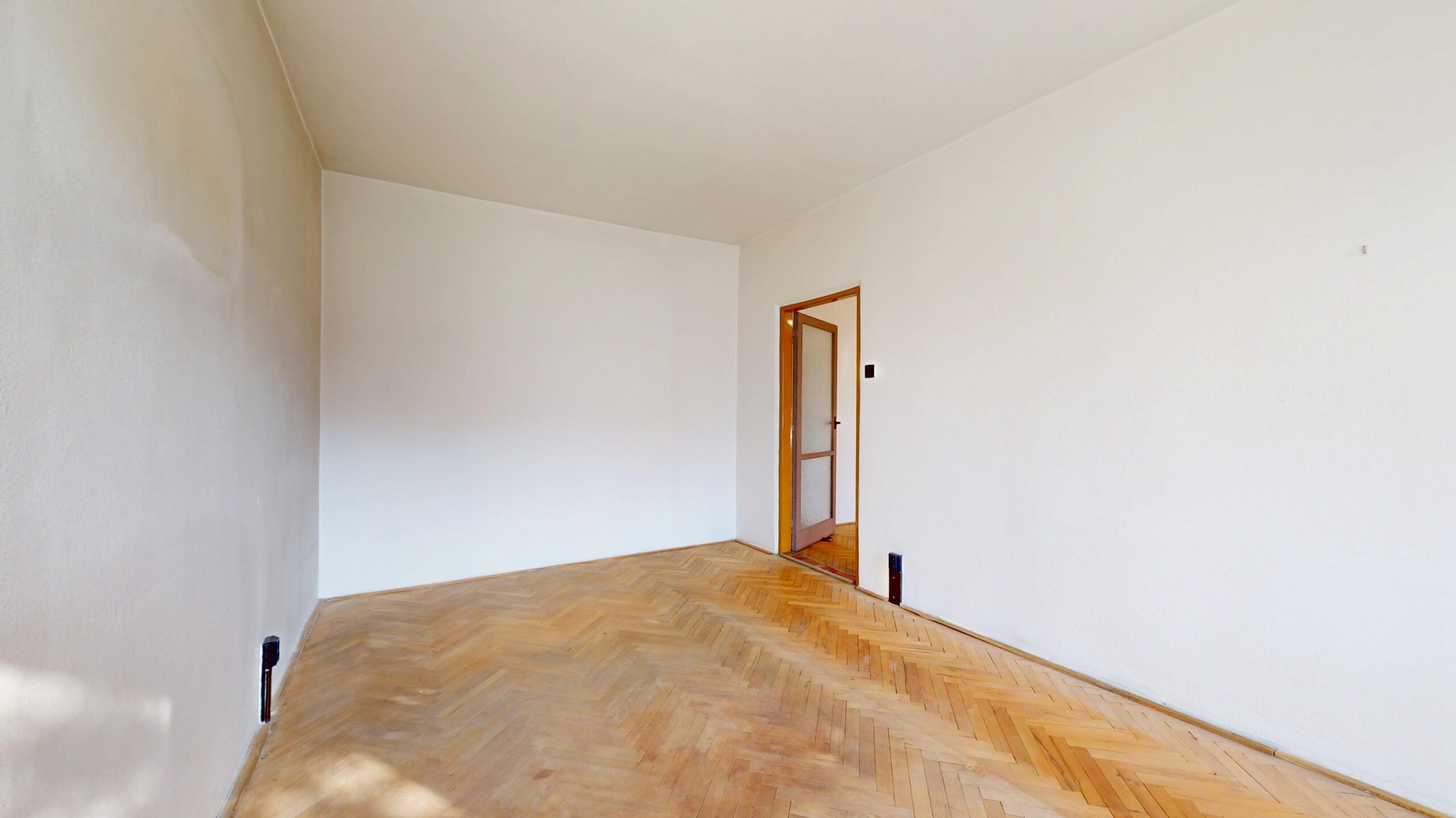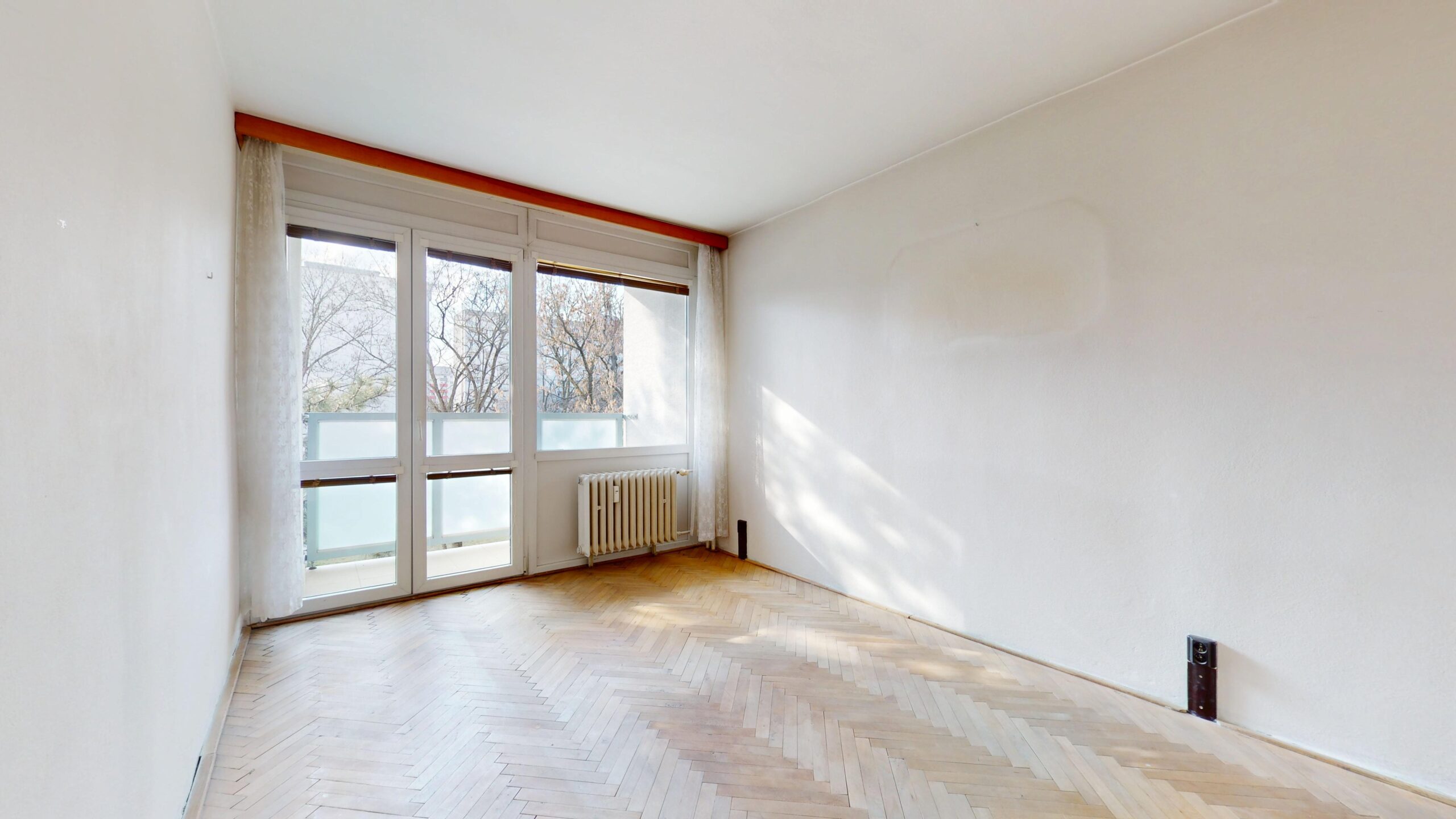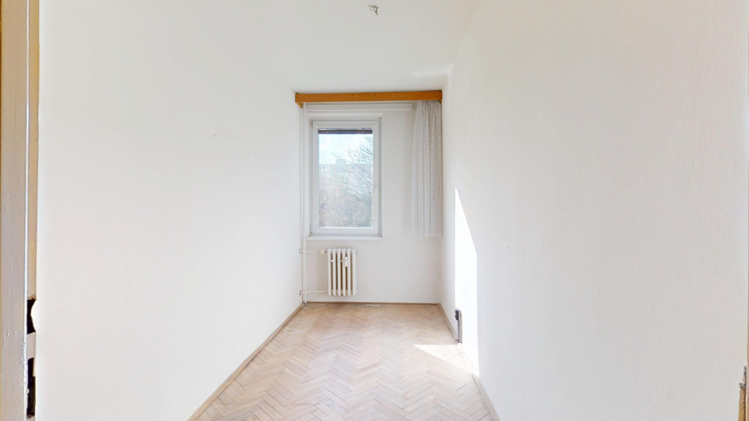 Z chodby sa vchádza do menšej spálne, ktorá je orientovaná na západ a ponúka výhľad do zelene. Jedno veľké okno zabezpečujú dostatok denného svetla počas celého dňa. Podlahu tvoria pôvodné drevené parkety, ktoré si zaslúžia renováciu, no už teraz dodávajú miestnosti retro šarm. Z tejto izby by mohla byť skvelá detská izba či pracovňa.