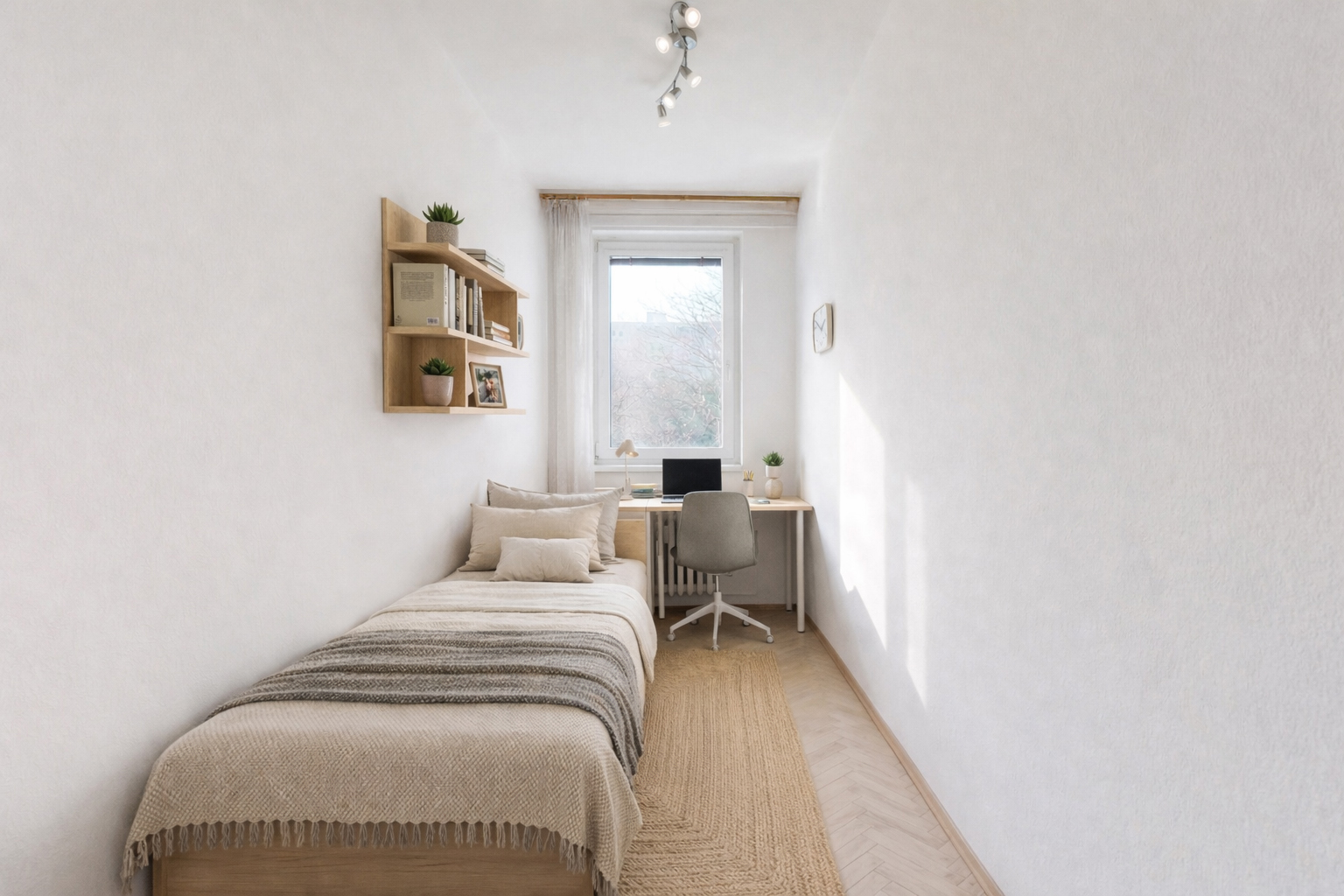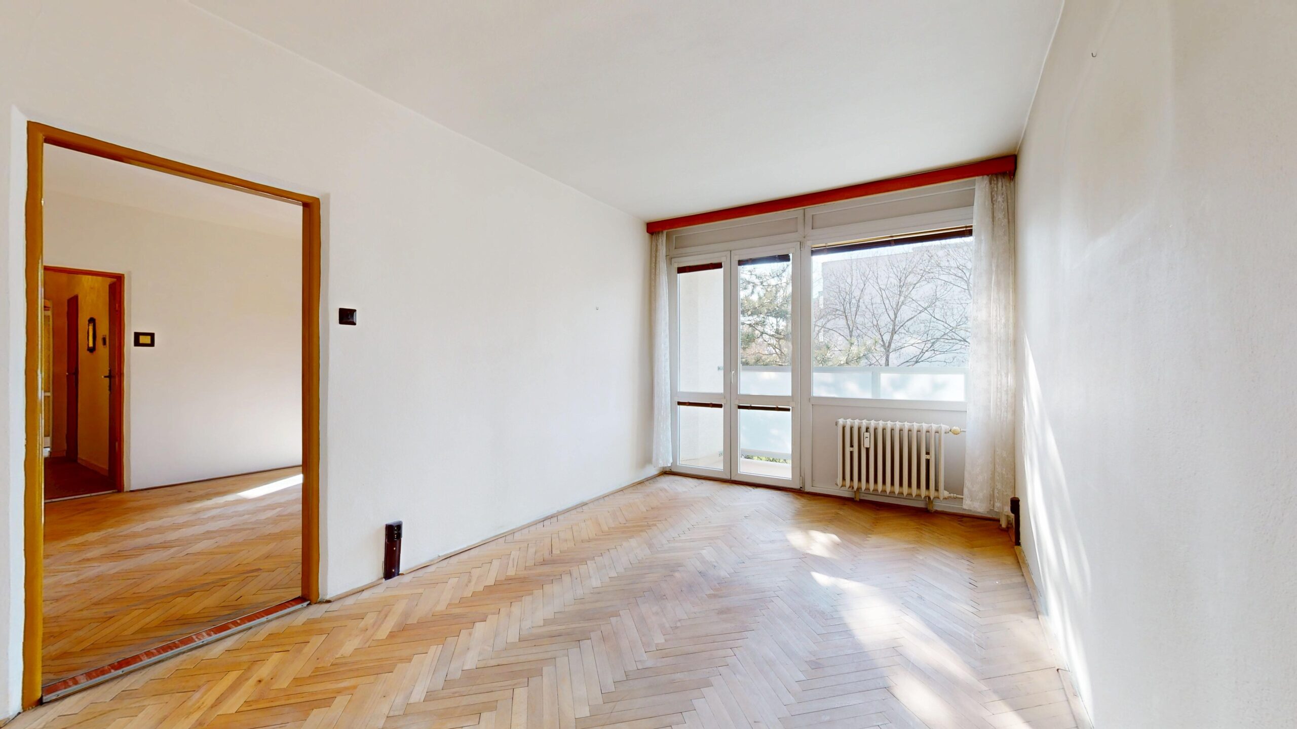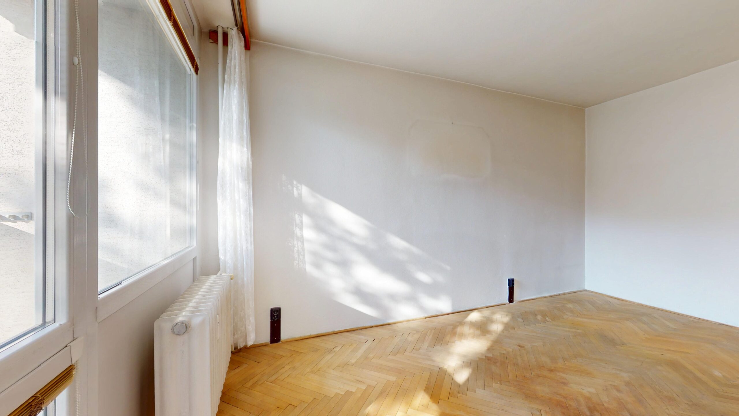 Z chodby sa vchádza do menšej spálne, ktorá je orientovaná na západ a ponúka výhľad do zelene. Jedno veľké okno zabezpečujú dostatok denného svetla počas celého dňa. Podlahu tvoria pôvodné drevené parkety, ktoré si zaslúžia renováciu, no už teraz dodávajú miestnosti retro šarm. Z tejto izby by mohla byť skvelá detská izba či pracovňa.