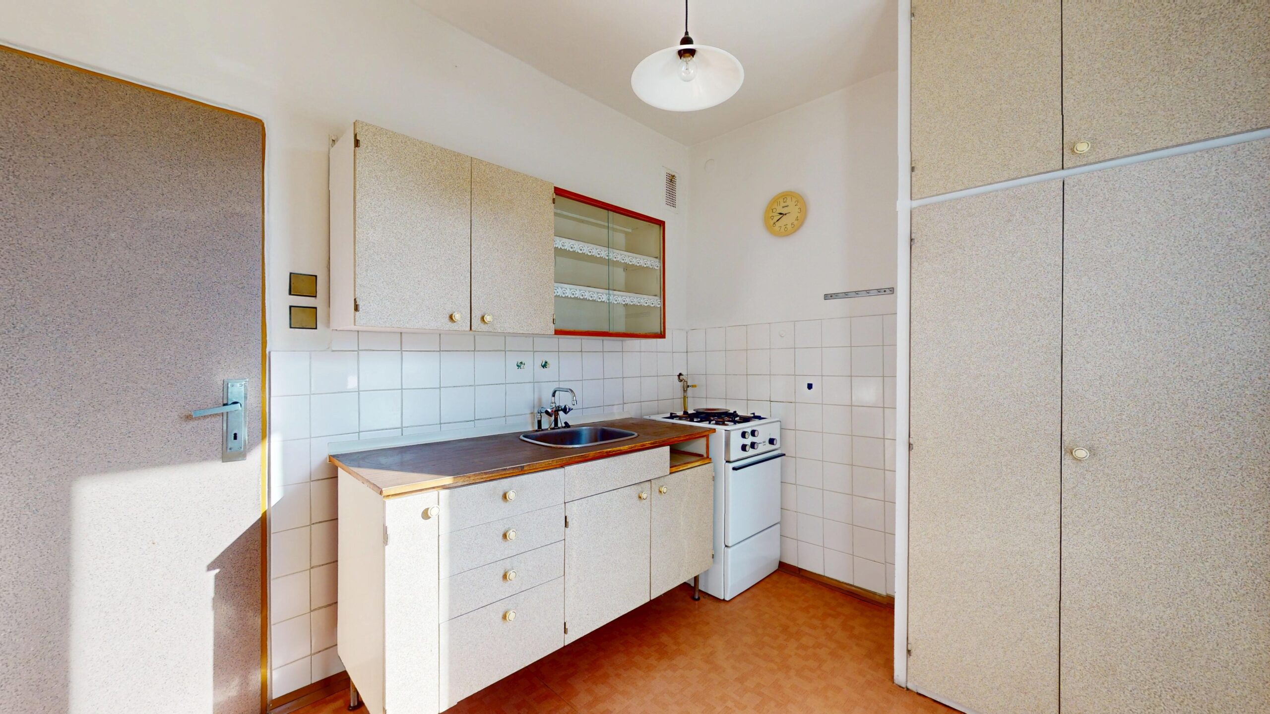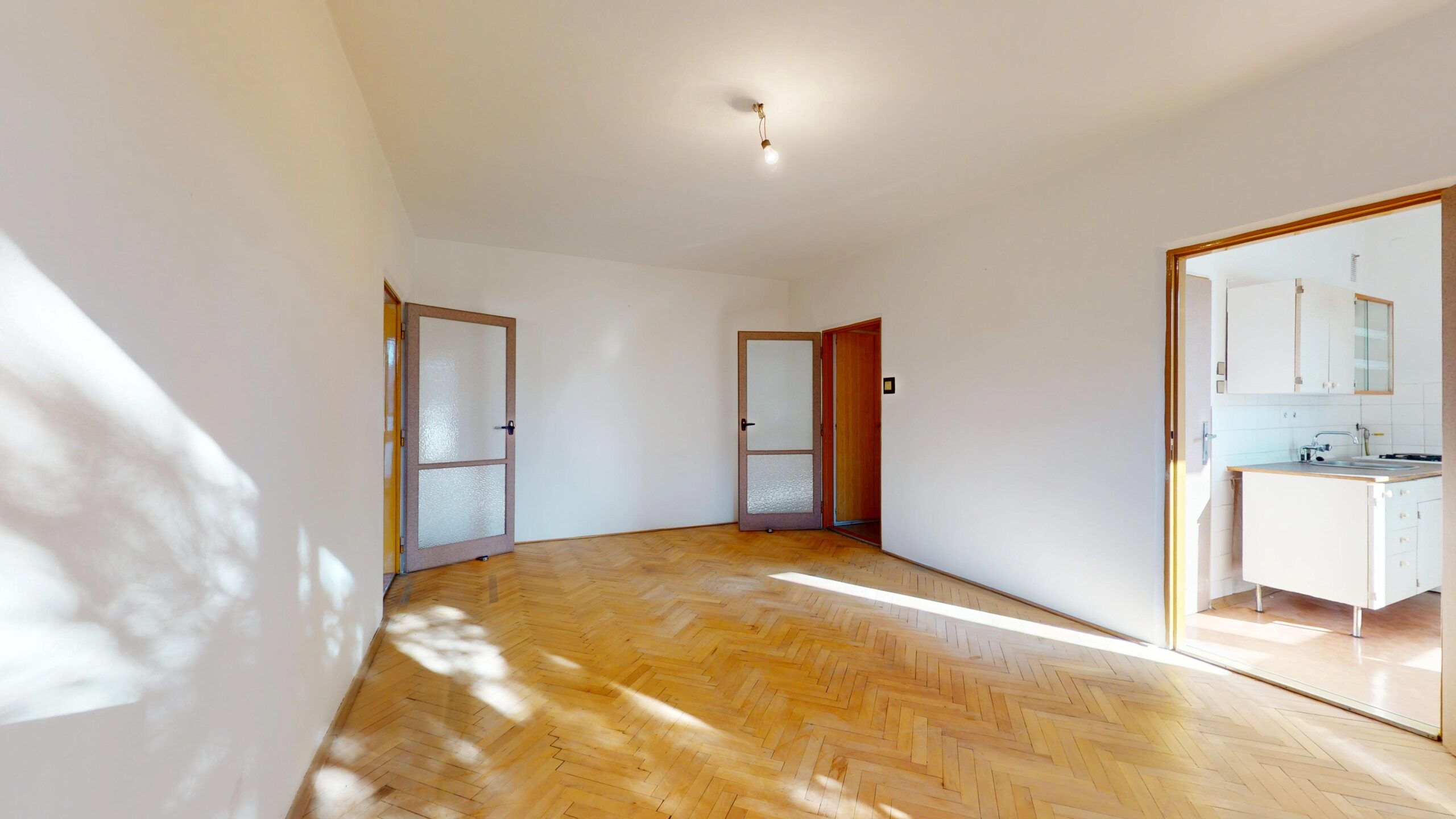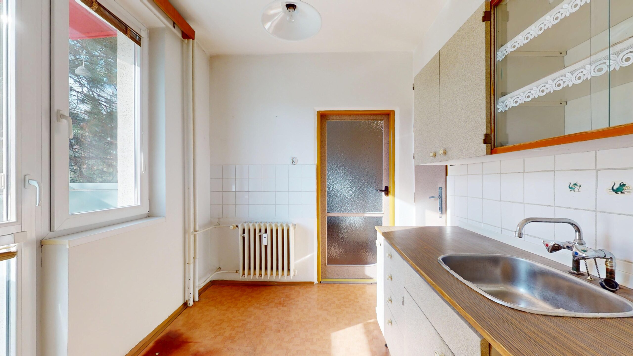 Obývačka plynulo prechádza do kuchyne, ktorá je oddelená dverami, po rekonštrukcii tu vie vzniknúť pekná rohová kuchynská linka so špajzou a menším jedálenským stolom alebo barovým sedením.