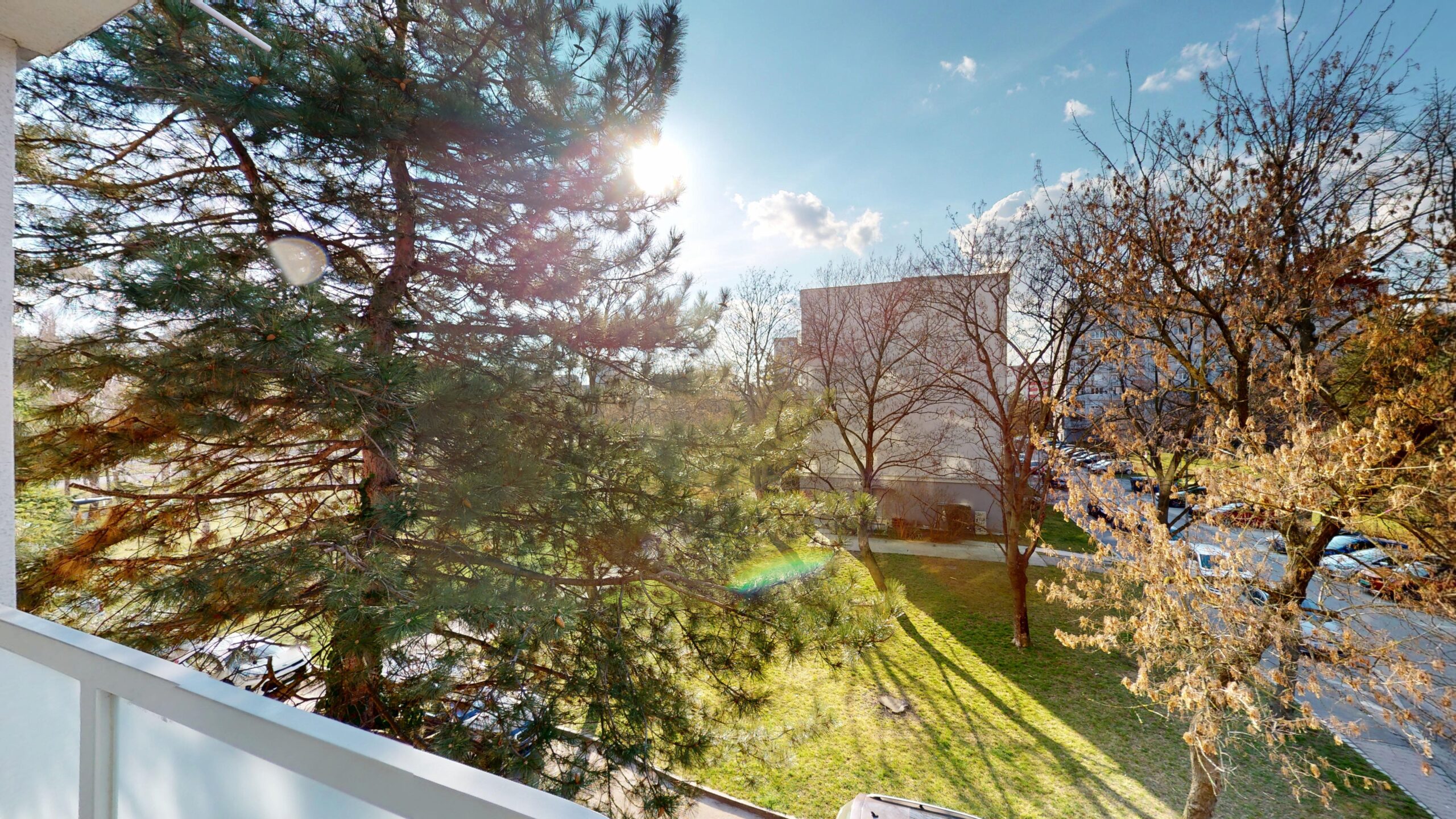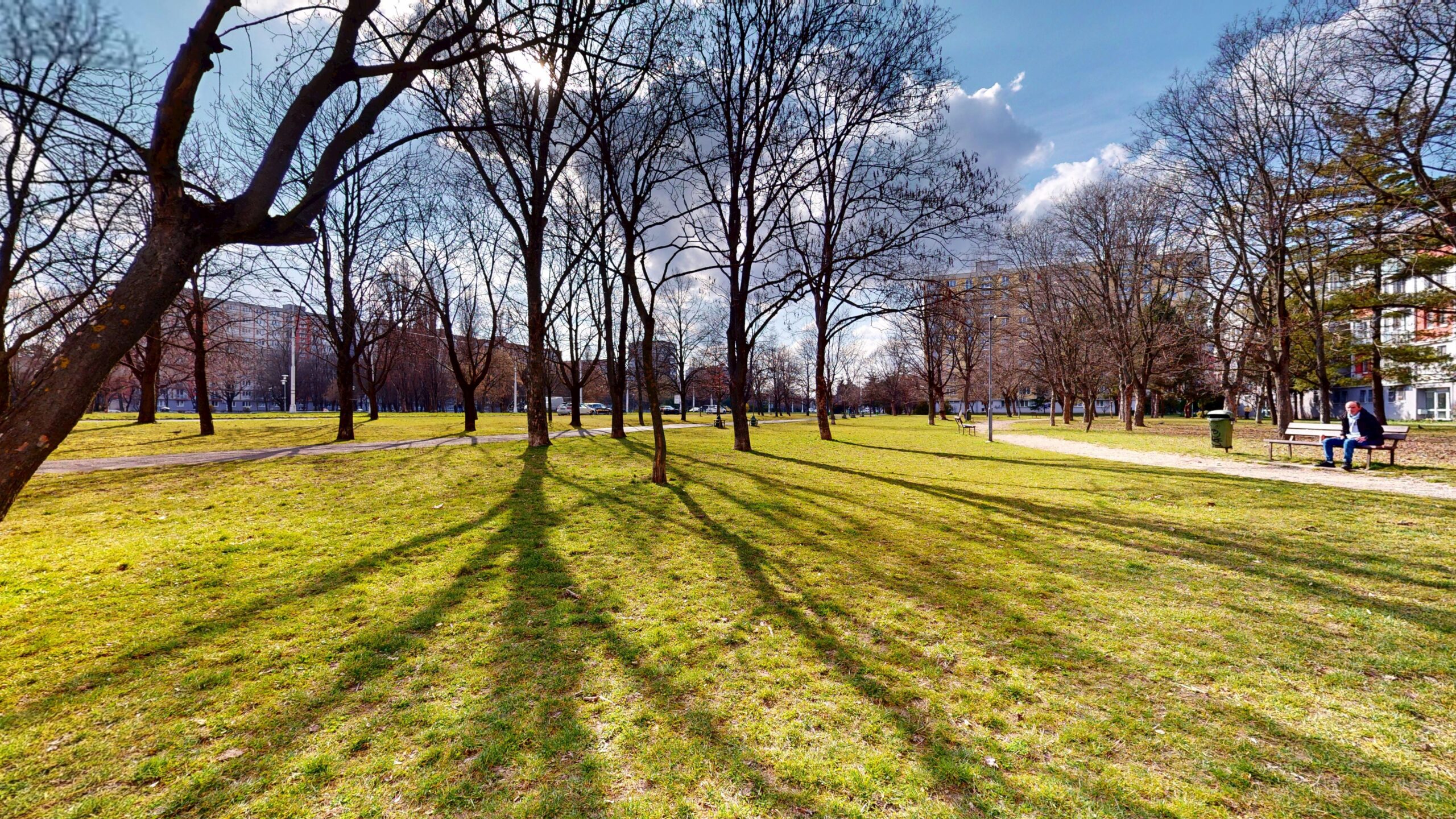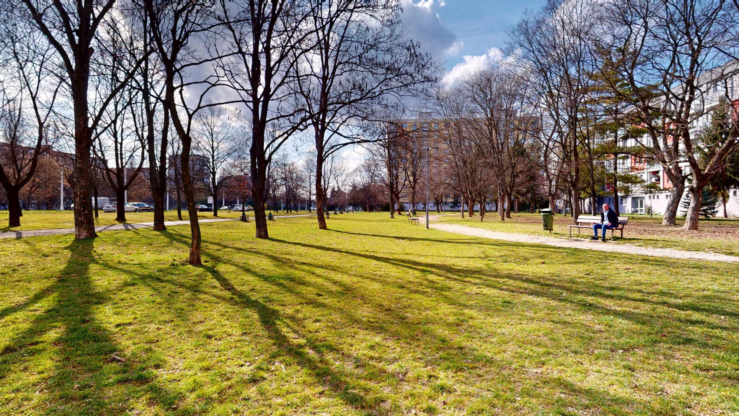 Priamo pod oknami bytu sa rozprestiera príjemná zatrávnená plocha s množstvom vzrastlých listnatých aj ihličnatých stromov. Tie vytvárajú prirodzený tieň počas horúcich dní, no zároveň neuberajú bytu na svetle. Je to presne ten typ výhľadu, ktorý vám dá pocit súkromia a pokoja aj uprostred mesta, aj vďaka tomu, že bytové domy tu nie sú postavené nahusto ako v iných bratislavských lokalitách.