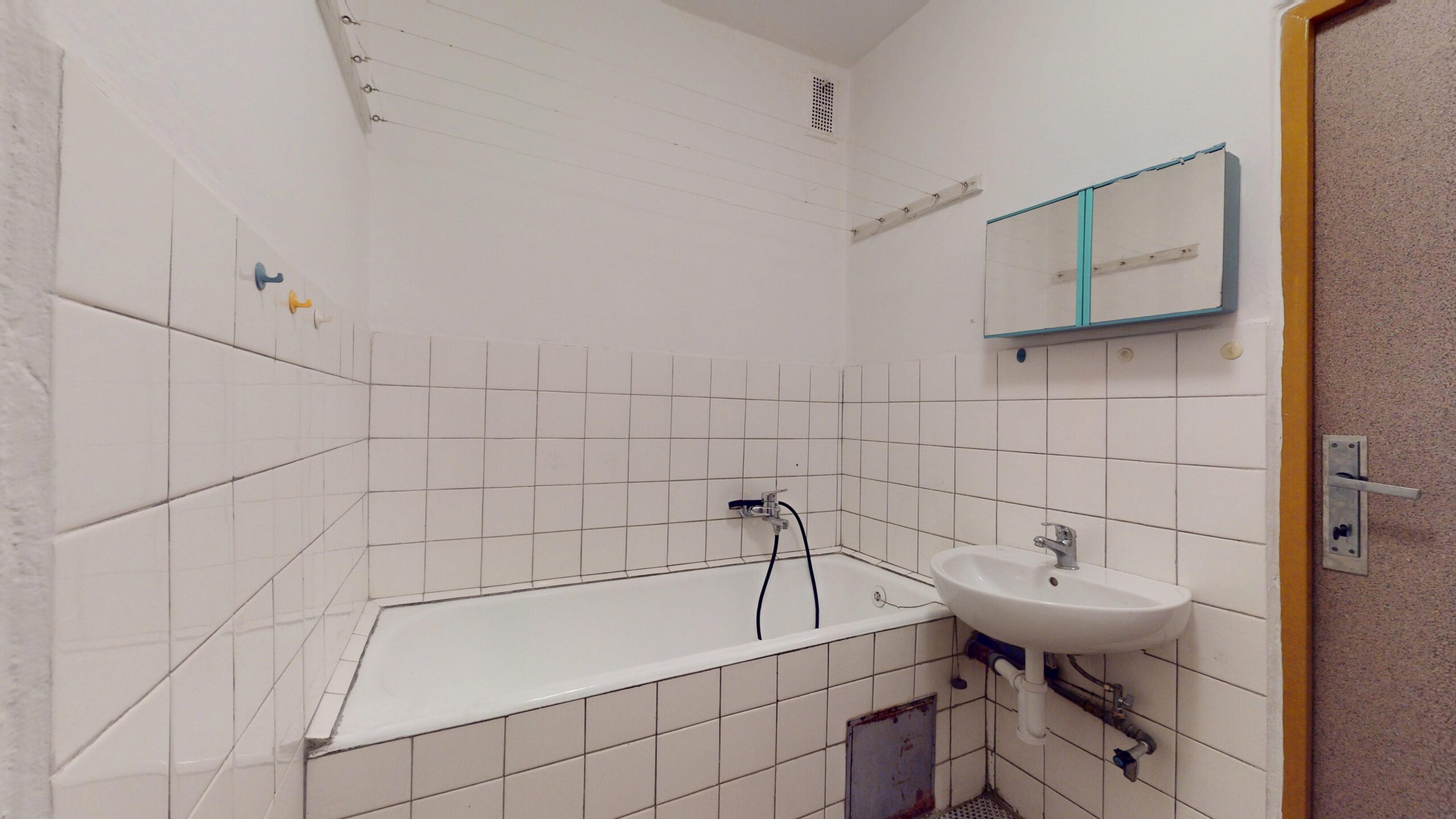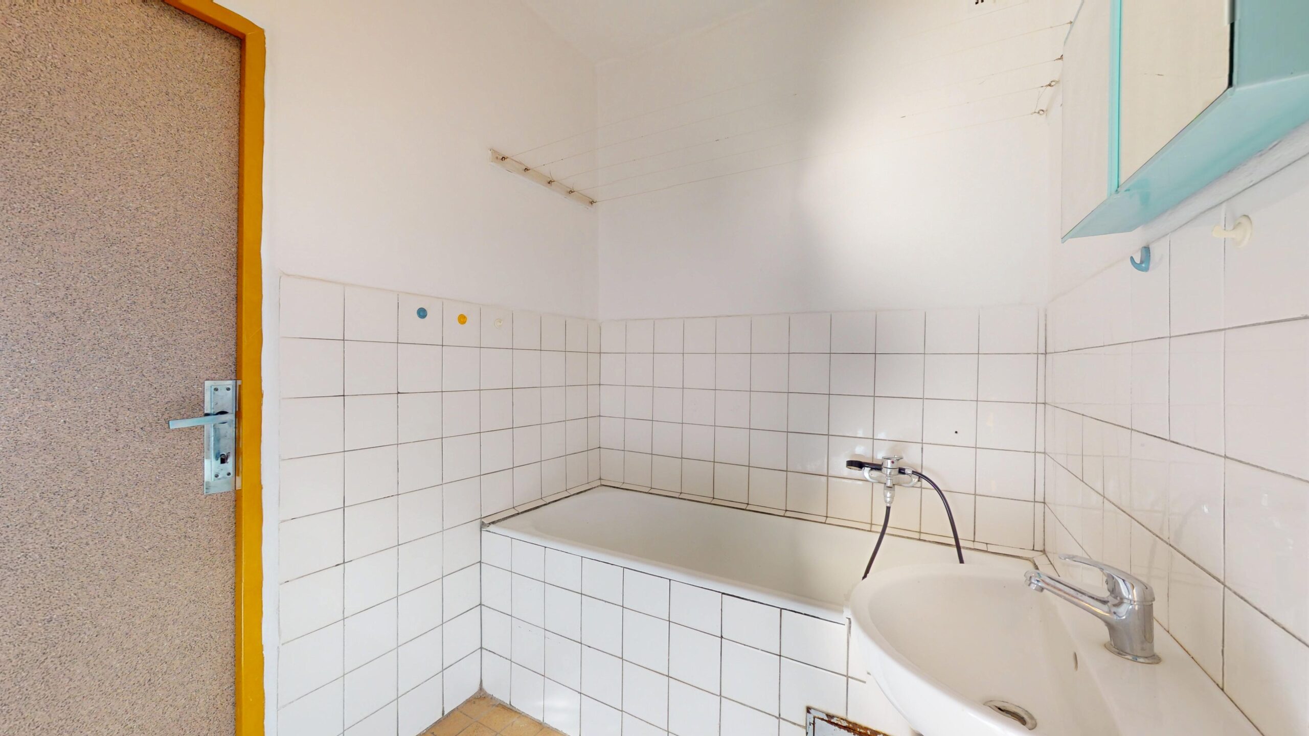 Kúpeľňa je pôvodná s klasickými retro bielymi obkladmi 10x10cm, jadro je vymurované a keď sa uzavrie prechod do kuchyni vznikne tu pekný priestor nielen na práčku ale aj úložné skrinky. Nájdete tu klasickú vaňu so sprchovou hlavicou a keramické umývadlo.