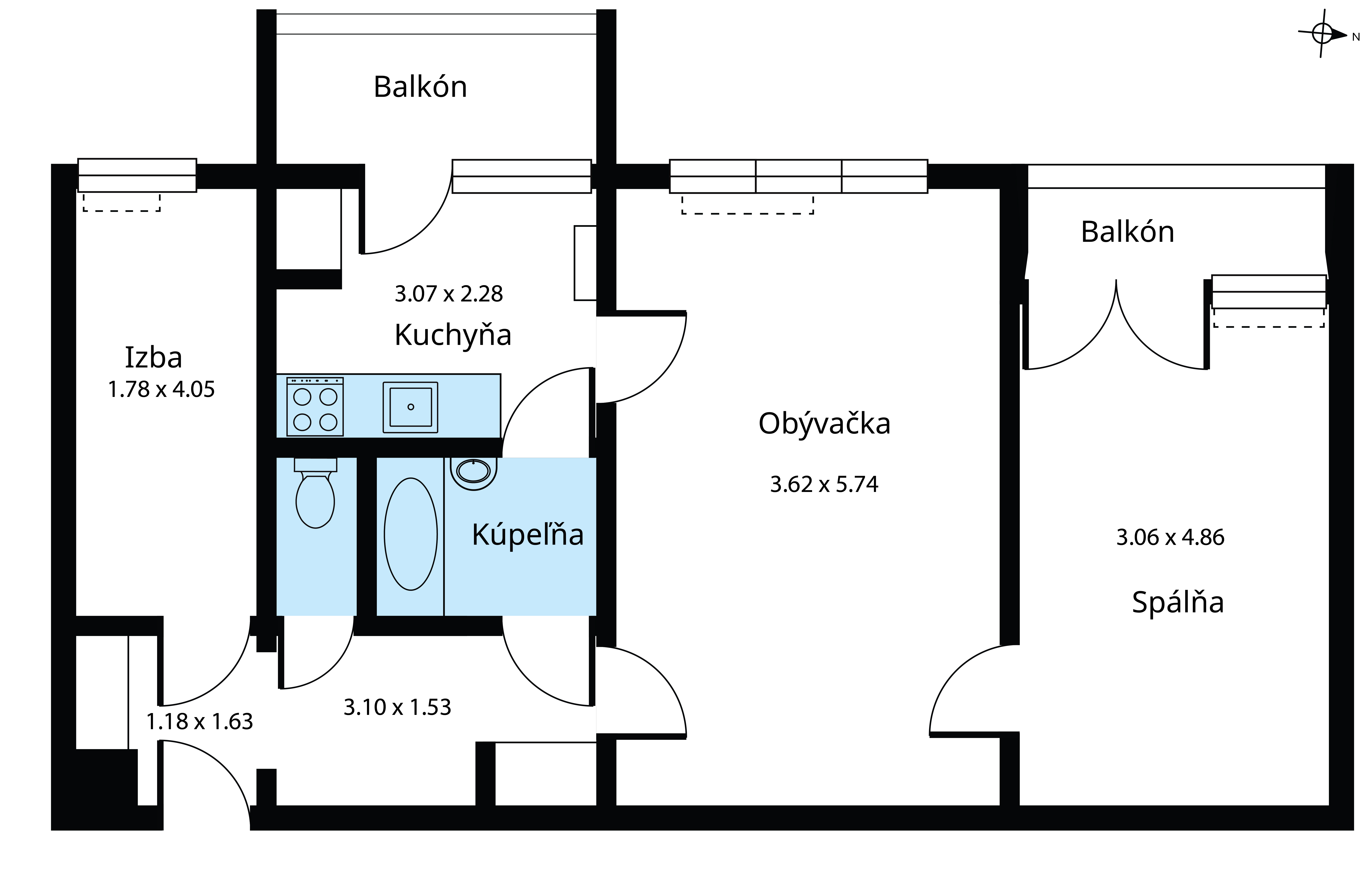 - predsieň, menšia izba,kúpeľňa a samostatné WC, spálňa, kuchyňa, obývačka