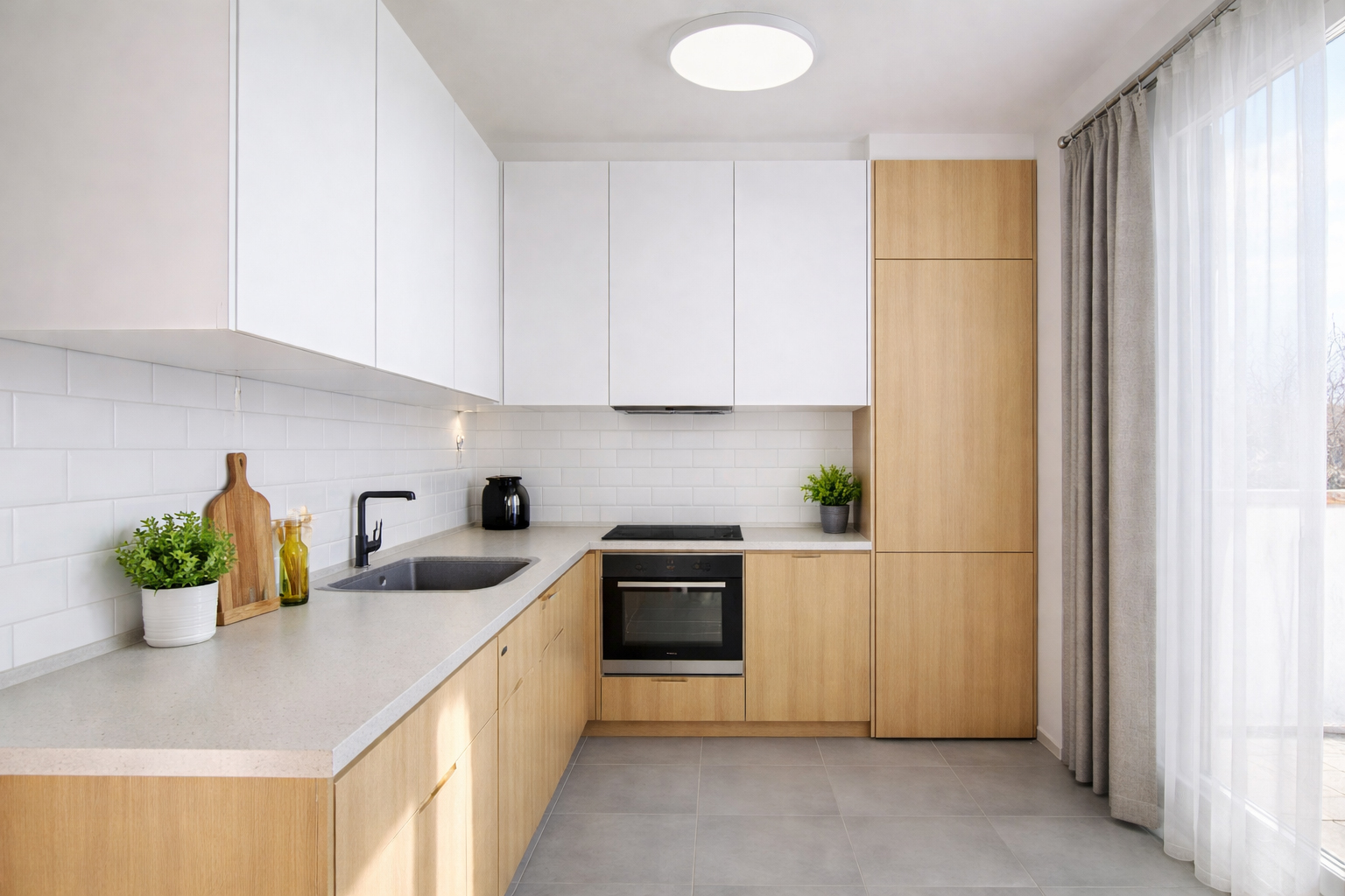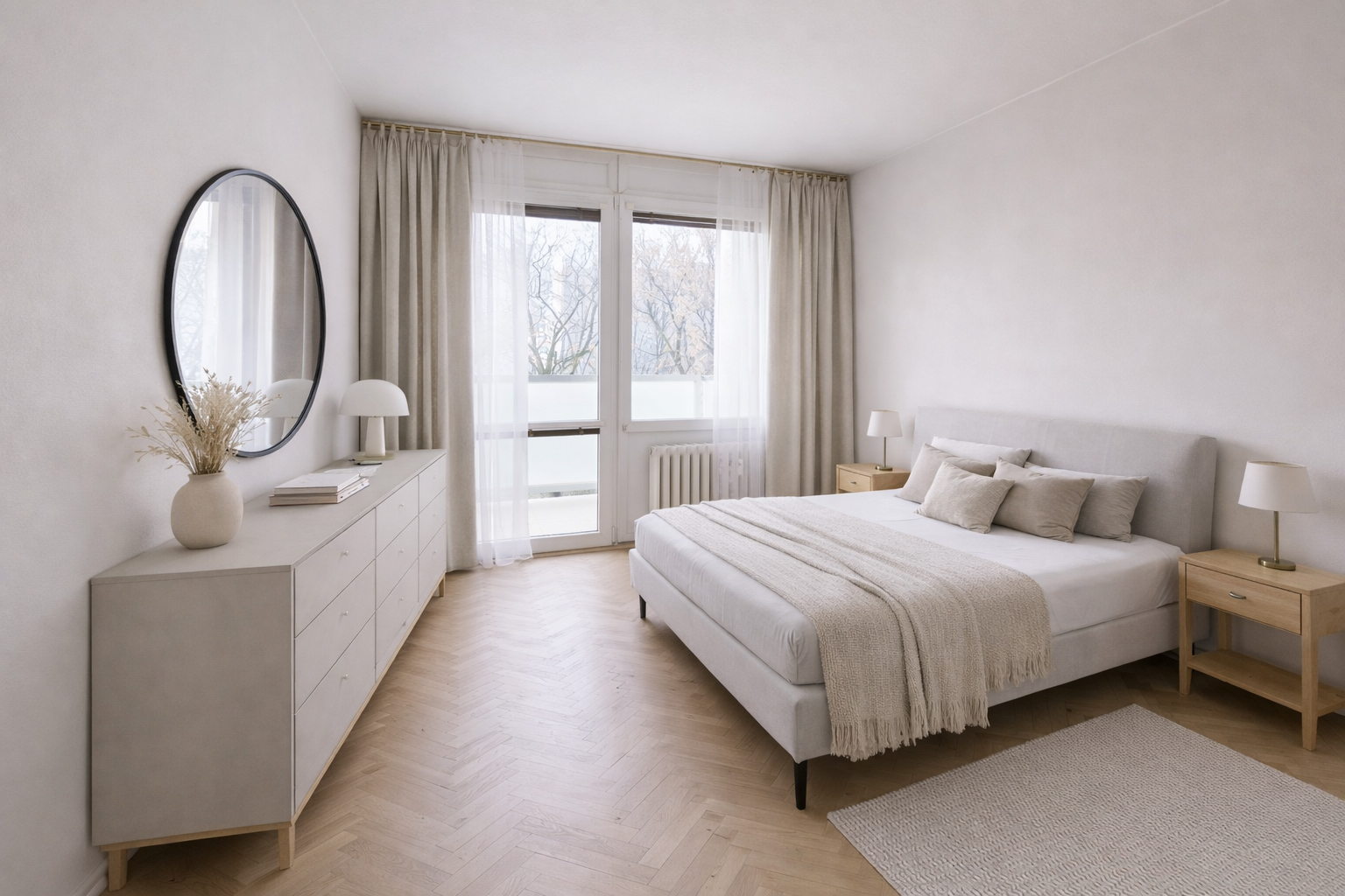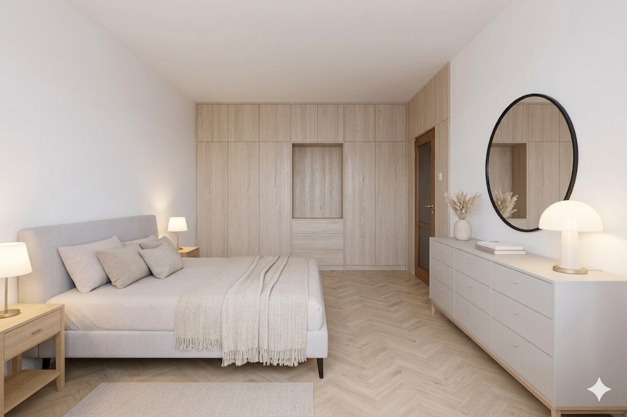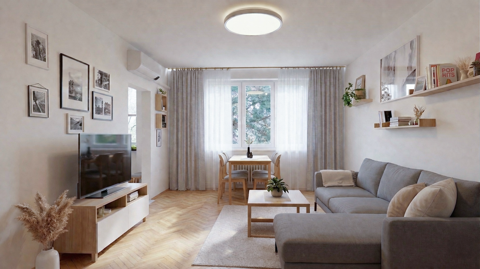 Srdcom bytu je priestranná obývacia izba, ktorá vďaka veľkému oknu orientovanému na západ ponúka dostatok denného svetla počas celého dňa. Priestor pôsobí vzdušne a pohodlne, či už si tu predstavíte rodinné večere, filmový maratón alebo prácu z domu.